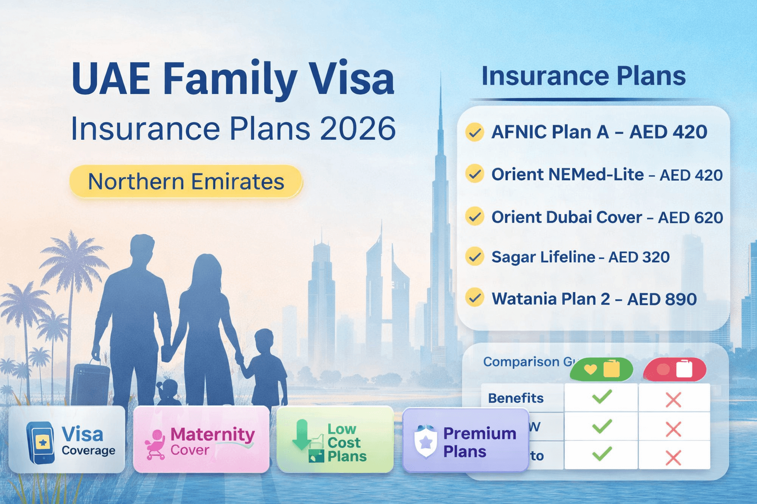 This guide explains the most popular UAE family visa insurance plans, their prices, coverage, benefits, limitations, and medical networks, helping you choose the right plan based on budget, emirate, and family needs.